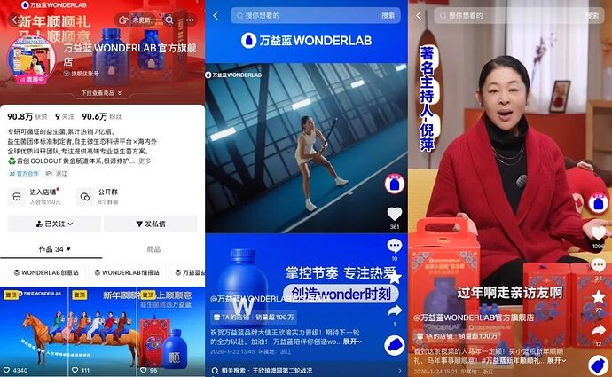 在运营层面,万益蓝采用“自播+达人直播”双轨模式,自播账号聚焦产品科普与日常转化,每日固定直播时长,通过主播专业讲解菌株功效、实验数据等内容,强化用户信任;达人直播则覆盖头部、中腰部、尾部全层级,既与知名主播合作实现流量爆发,也通过中尾部达人的精准触达,覆盖更多细分人群。
