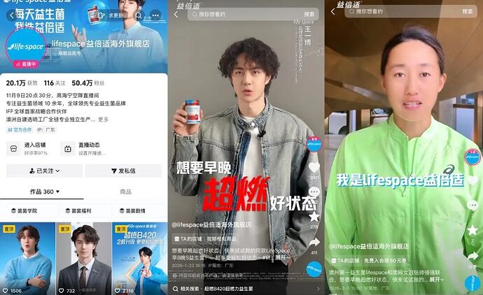 2023年,品牌签约@贾乃亮 为代言人,还与@国岳夫妇、@涂磊、@董先生等头部主播深度绑定,2024年抖音618大促期间登顶该平台益生菌类目销售TOP1,单场直播GMV曾突破5000万元,用户复购率高达78%,积累近300万高端会员,成为益生菌赛道的现象级品牌。