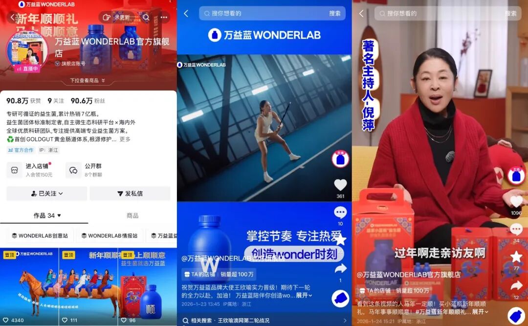 根据东方快消品中心发布的“2025年抖音TOP金品榜——益生菌”,销售额TOP10的益生菌品牌依次为:万益蓝、呜咔实验室、菌小宝、益倍适(汤臣倍健旗下)、华大营养、湘雅康尔福、星球兽、贝莱健、白云山、帕米奥。卡思选取了万益蓝(榜首)、呜咔实验室(细分赛道标杆)、益倍适(药企背景代表)三个代表性品牌,梳理其抖音运营逻辑,可窥见益生菌品牌在直播电商中的生存之道。