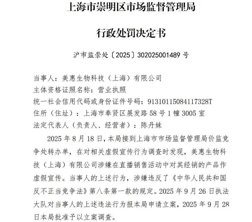 近日,益生菌品牌菌小宝相关经销主体——美惠生物科技(上海)有限公司,因在直播中对旗下“太空30号”产品进行虚假宣传,被上海市崇明区市场监督管理局处以3万元罚款。