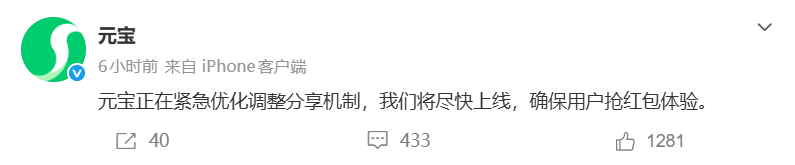 还好,事件发生后,元宝官方迅速给出了回应,说正在紧急优化调整分享机制,尽快上线,确保用户抢红包体验。随后就以最快的速度,将分享形式变成“口令红包”。