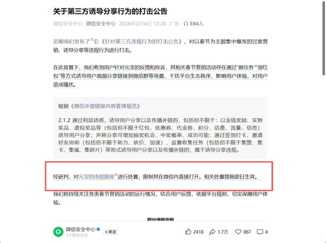 从微信官方与多方信源披露的信息来看,这次被处置的对象,并不是“元宝”这个AI 产品本身,而是其在春节期间推出的部分营销分享链接。