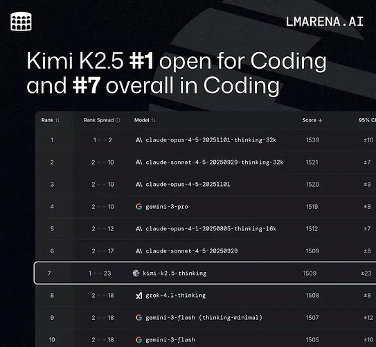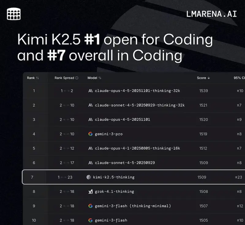 根据 LMArena(现改名为 arena.ai)的榜单,Kimi K2.5 的编码能力,是所有开源模型的第一,在总榜上仅次于 Claude 和 Gemini(下图)。