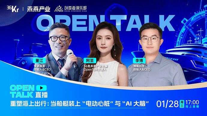 1月28日,36氪举办了以**「重塑海上出行:当船舶装上“电动心脏” 与 “AI 大脑”」为主题的OpenTalk直播活动,特别邀请擎波探索创始人&CEO董江、博鳐科技创始人&CEO李博**作为本场分享嘉宾,就高性能电动舷外机、新能源出海、全航程自主航行任务、全场景智能航行解决方案等话题展开了深入分享,并与观众进行了在线互动。